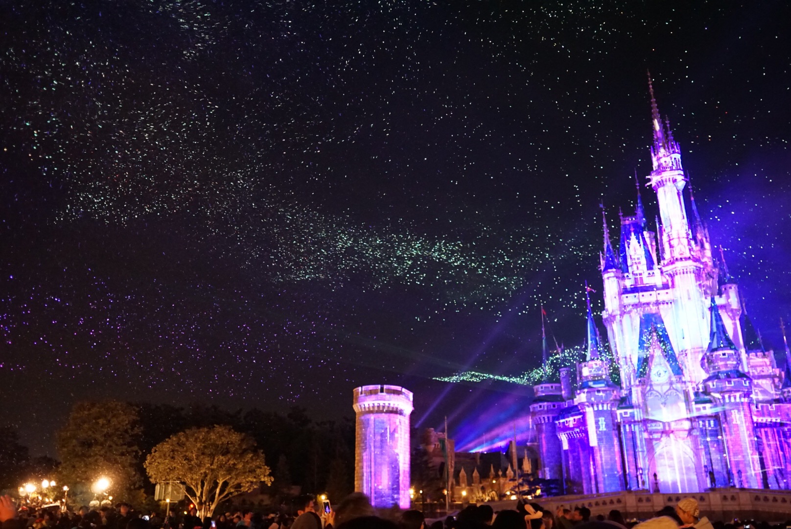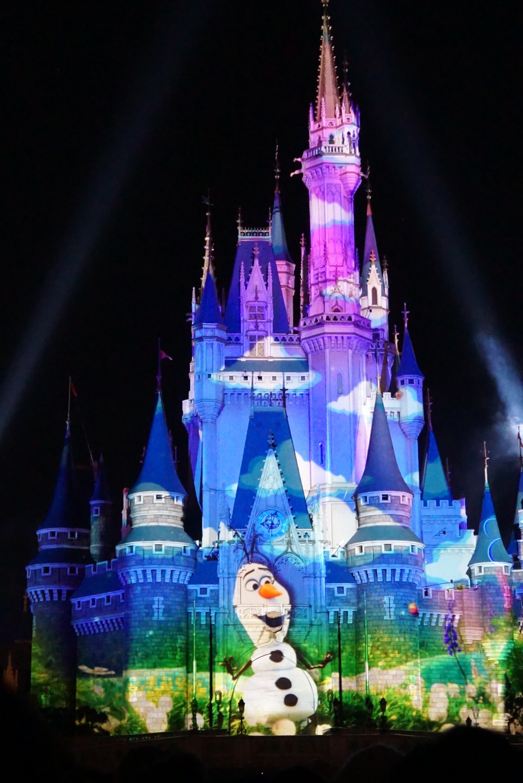 パレードだけみて空いてたらなんか乗れたらいいなーぐらいな気分で行ったのに、まさかのまさか、当たったことないプロジェクションマッピングのショー(今だけはアナ雪バージョンらしい)があたってしまった(笑)