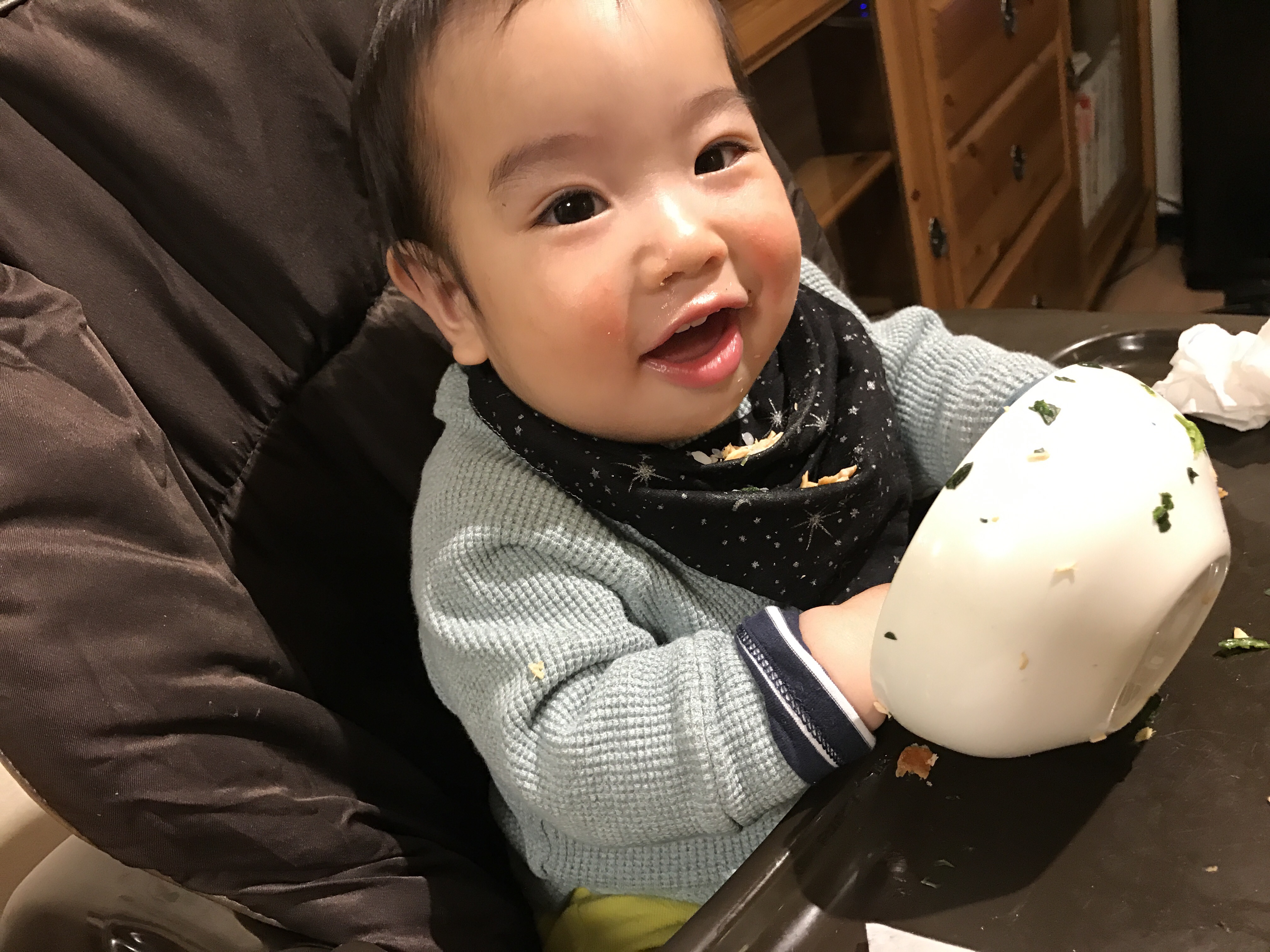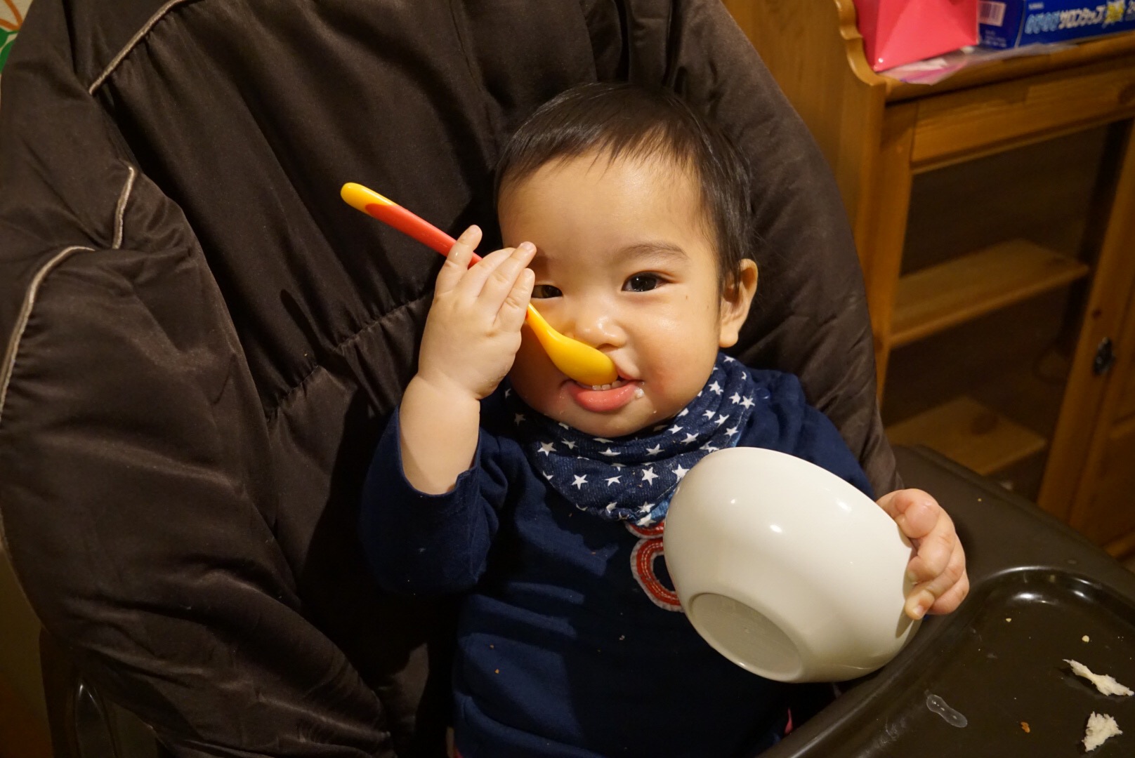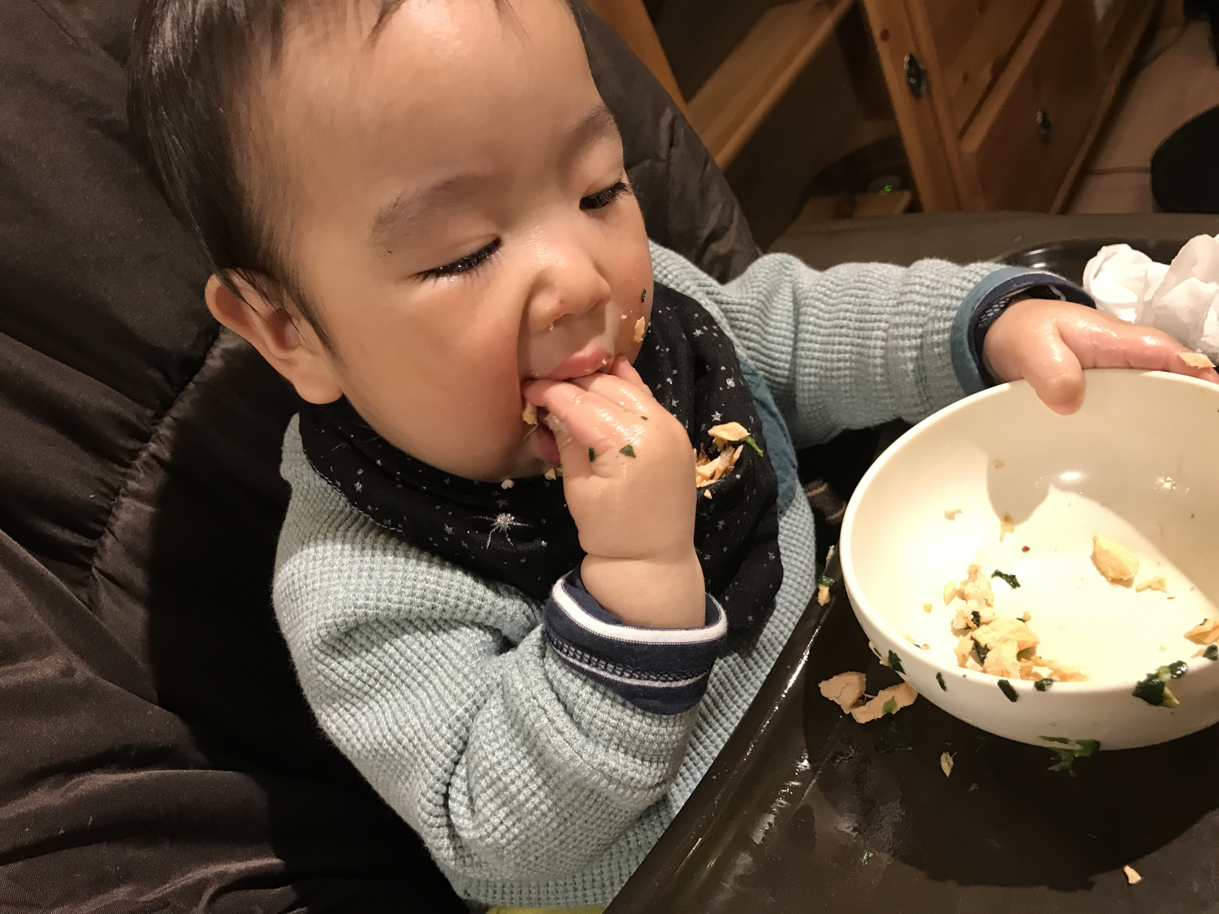 最初は食べやすいようにちぎったりした物をあげたりしてるけど、今日は最終的には、ごはんもおかずもそのまま手で食べていました(笑)