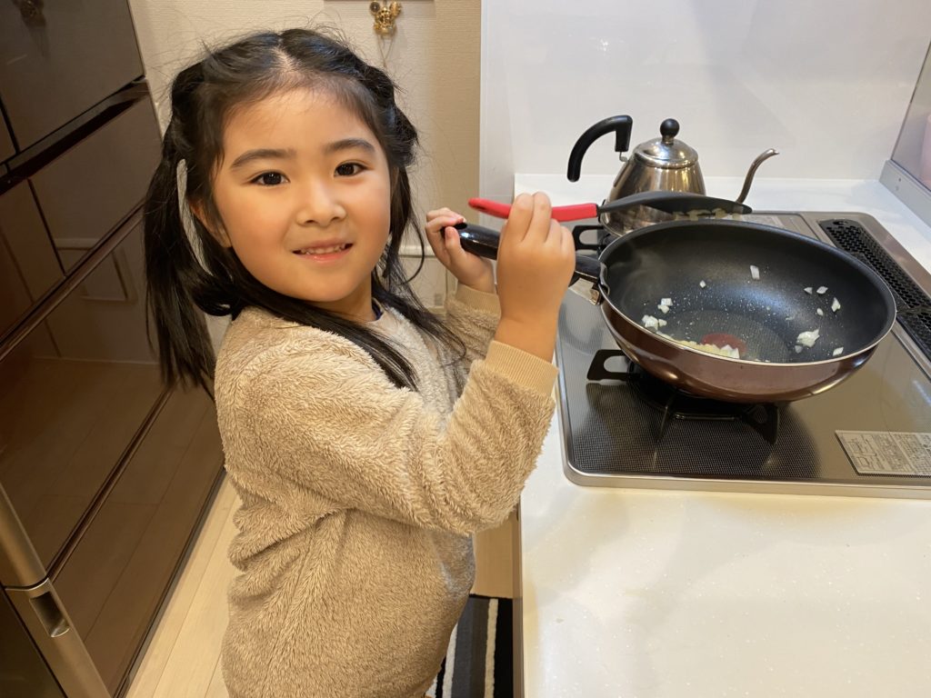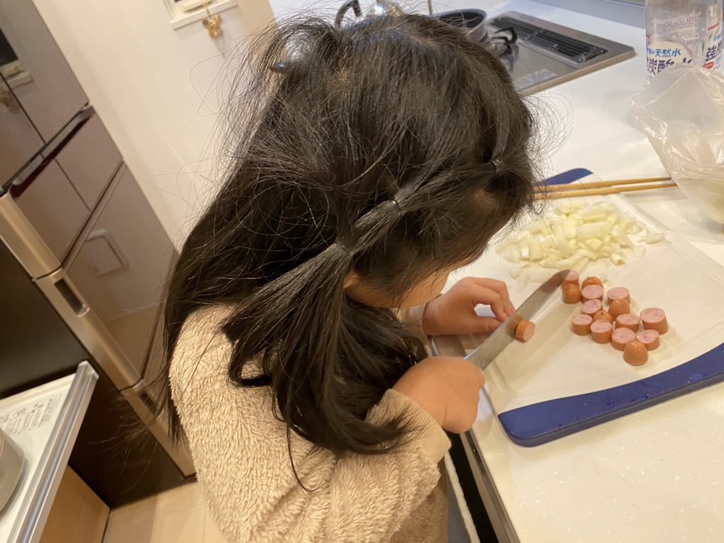 昨日は手伝いをしないで、包丁でウィンナーを切ってくれたので、一緒にオムライスを作ってみました。