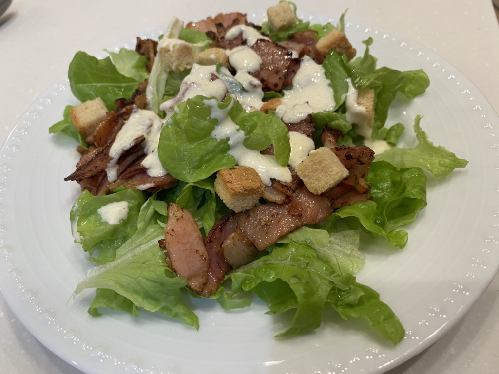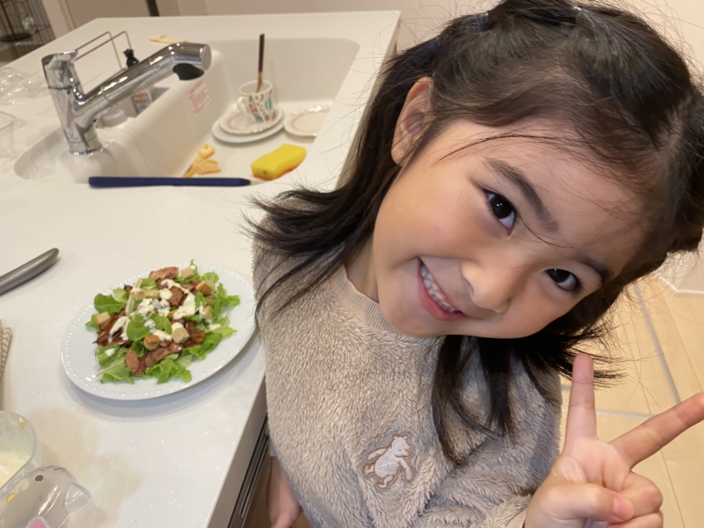 ちゃんと洗って、野菜とベーコンを切って、ドレッシングも分量を量りながら作ってくれました。
