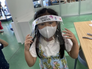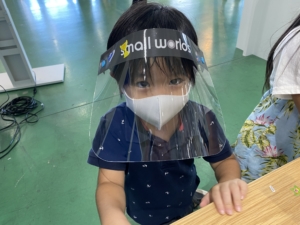 無料でつくれるフェイスシールドコーナーを見つけると、大はしゃぎ!